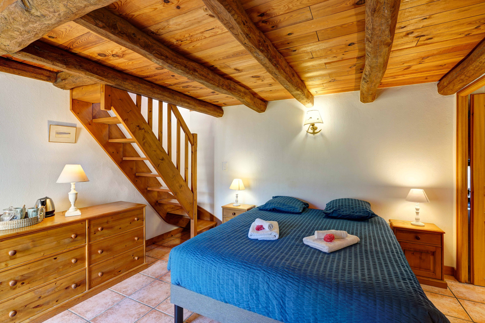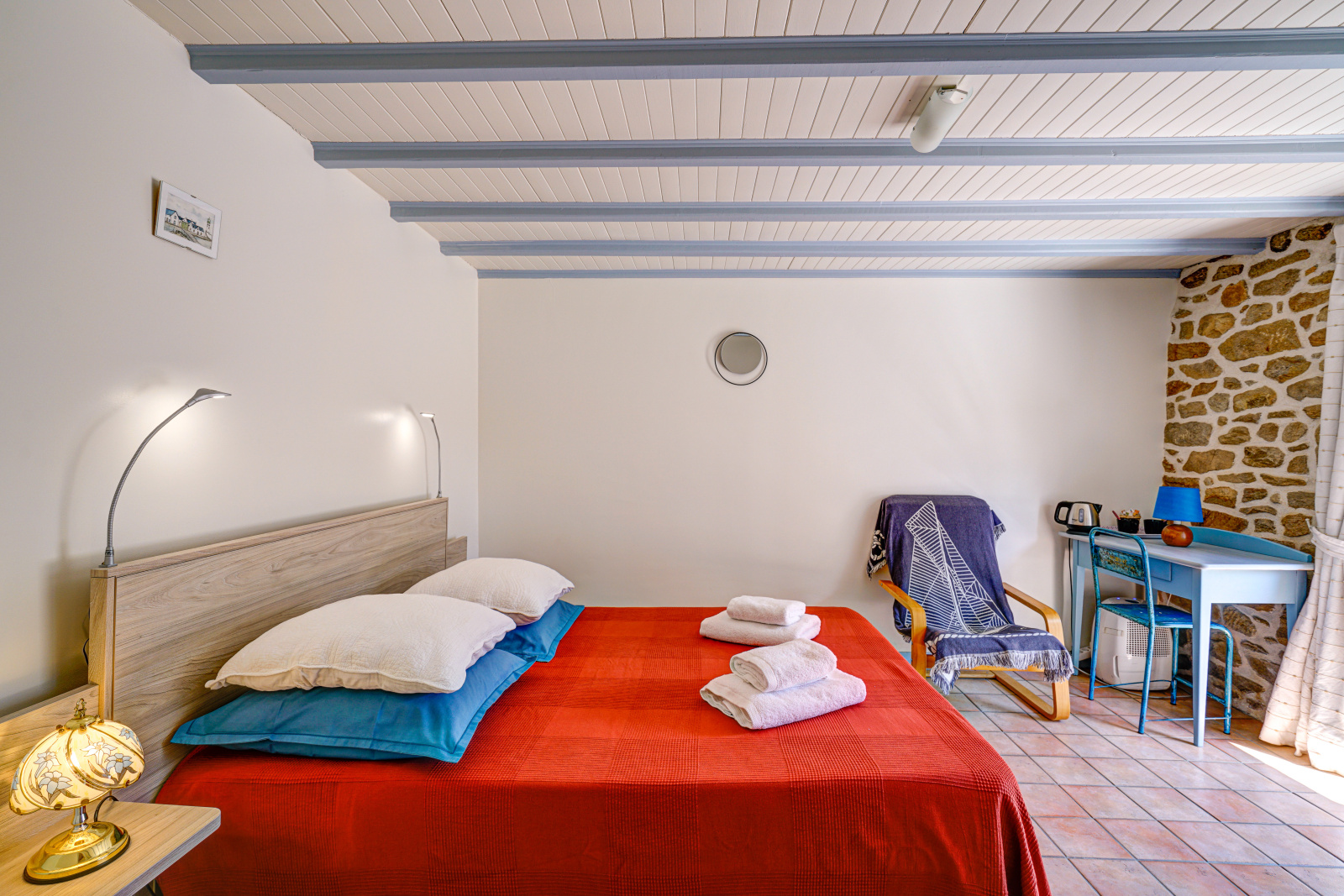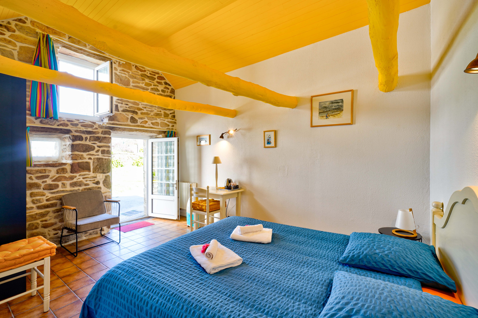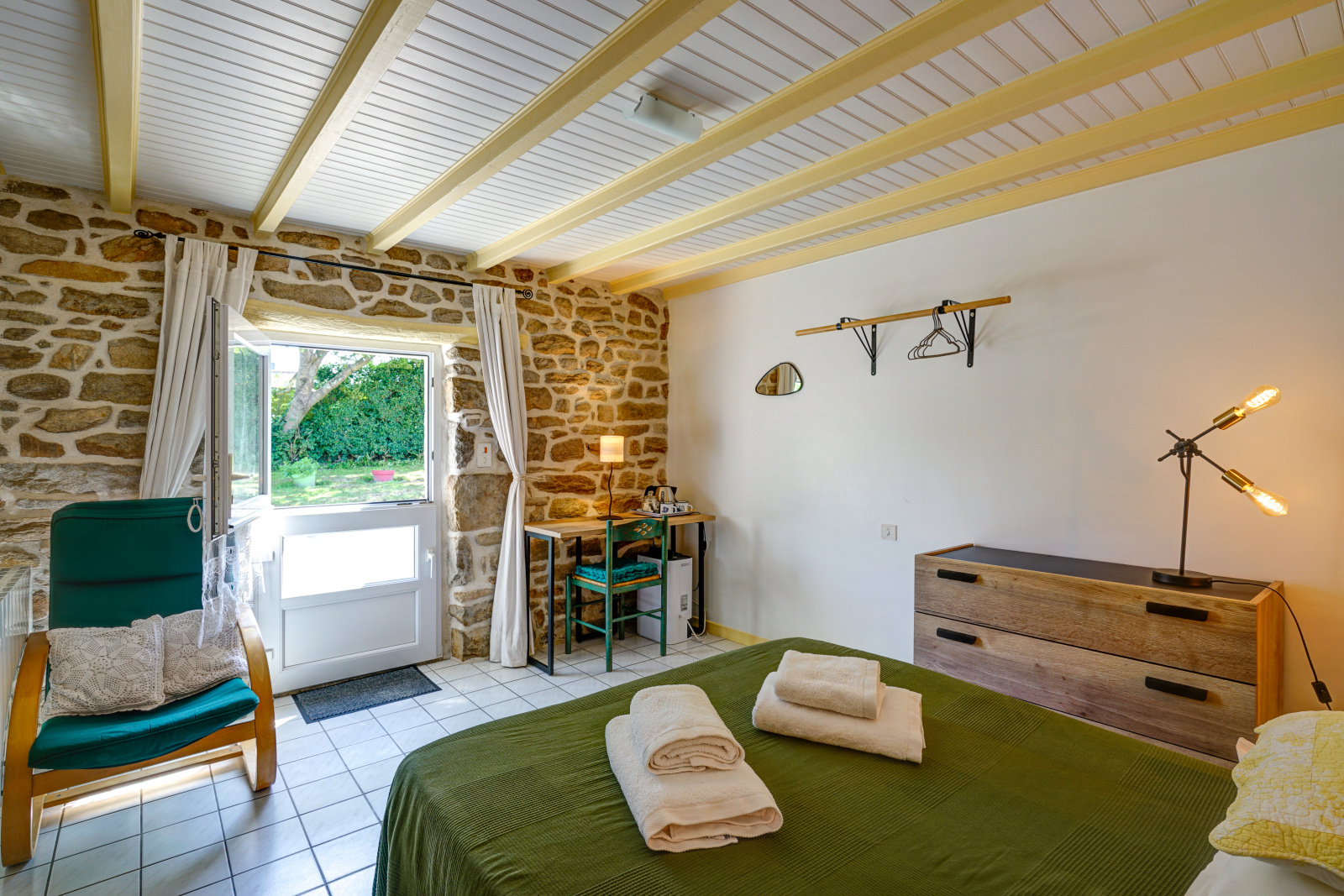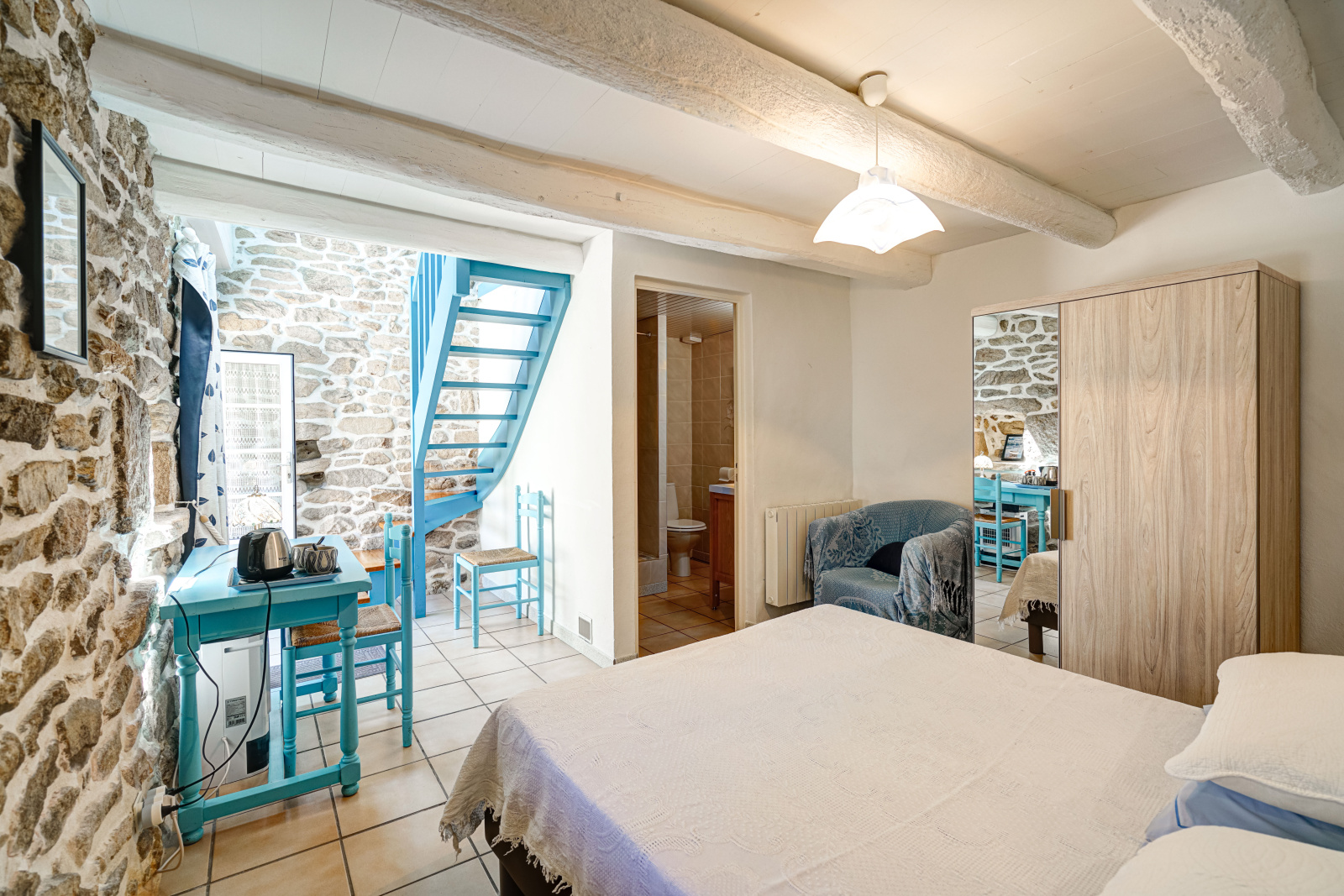 La partie gîte propose cinq chambres meublées, dont deux grandes chambres de 17 m² avec douche, deux duplex spacieux (31,5 m² et 29 m²) avec douche, et une chambre de 18 m² avec salle de bains privative. Ces espaces indépendants sont parfaits pour recevoir des hôtes en quête d’authenticité et de tranquillité.